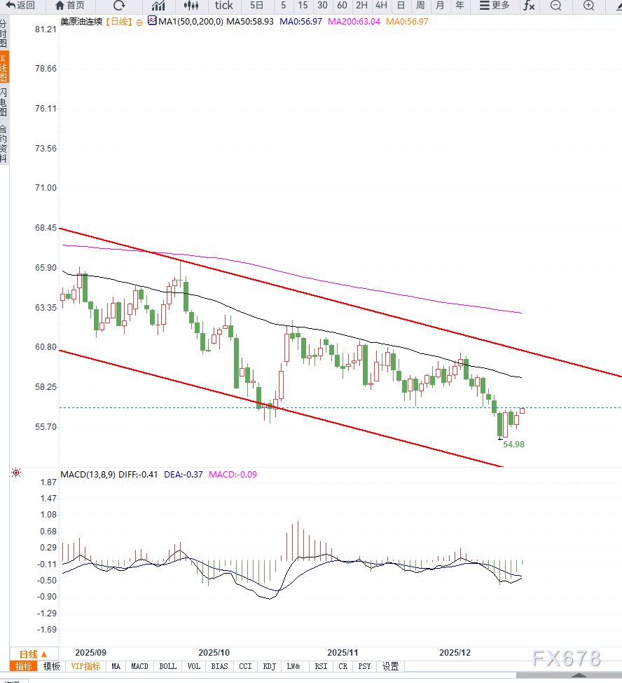 从日线图形来看,美原油(WTI)整体仍处于弱势震荡格局之中。价格目前运行在前期低位区域附近,56美元一线构成短期重要支撑位,若有效跌破,不排除测试前低的风险;
